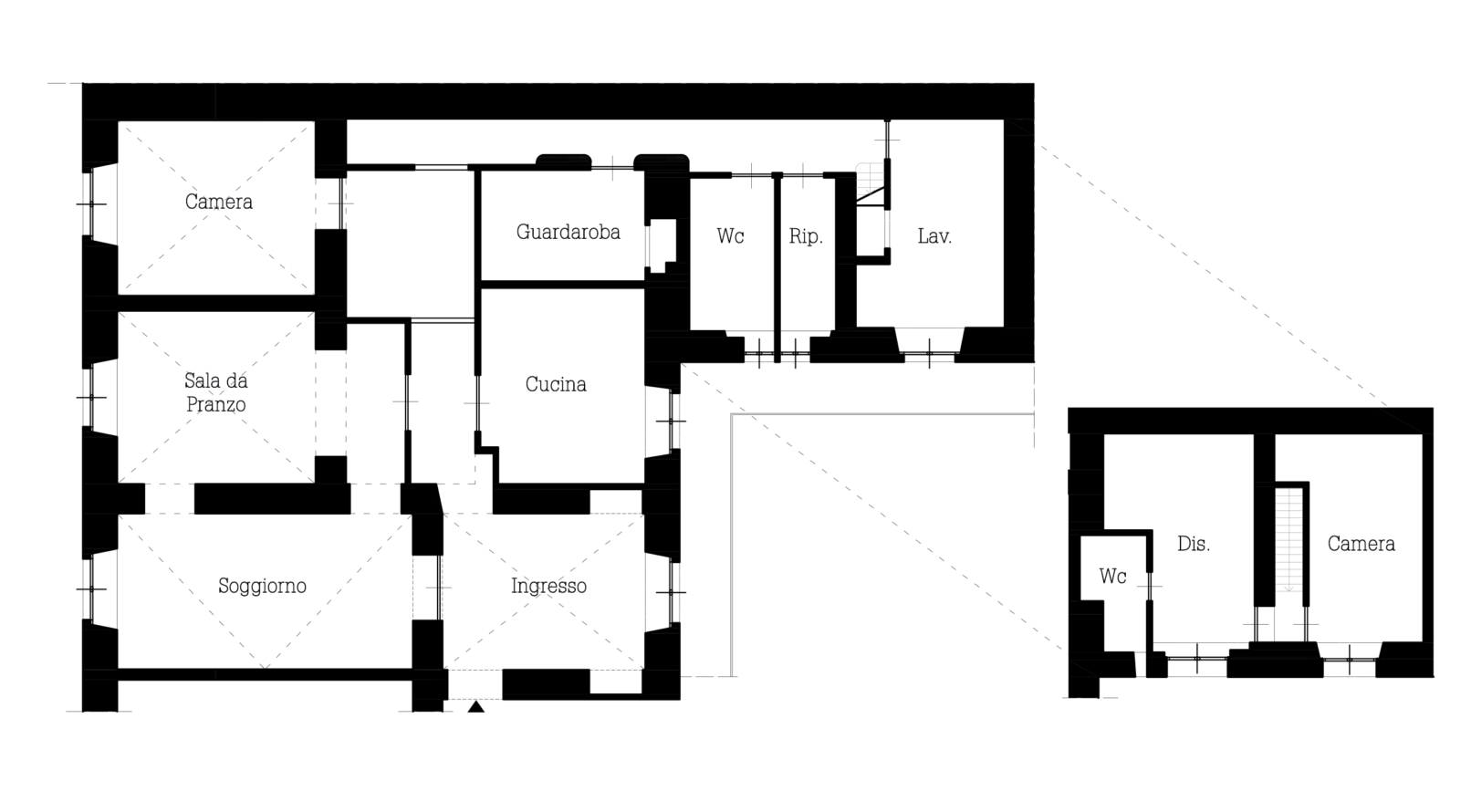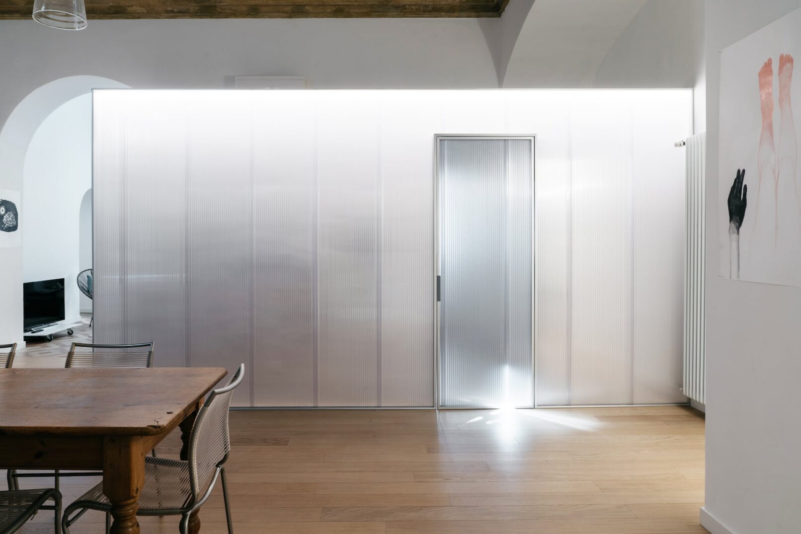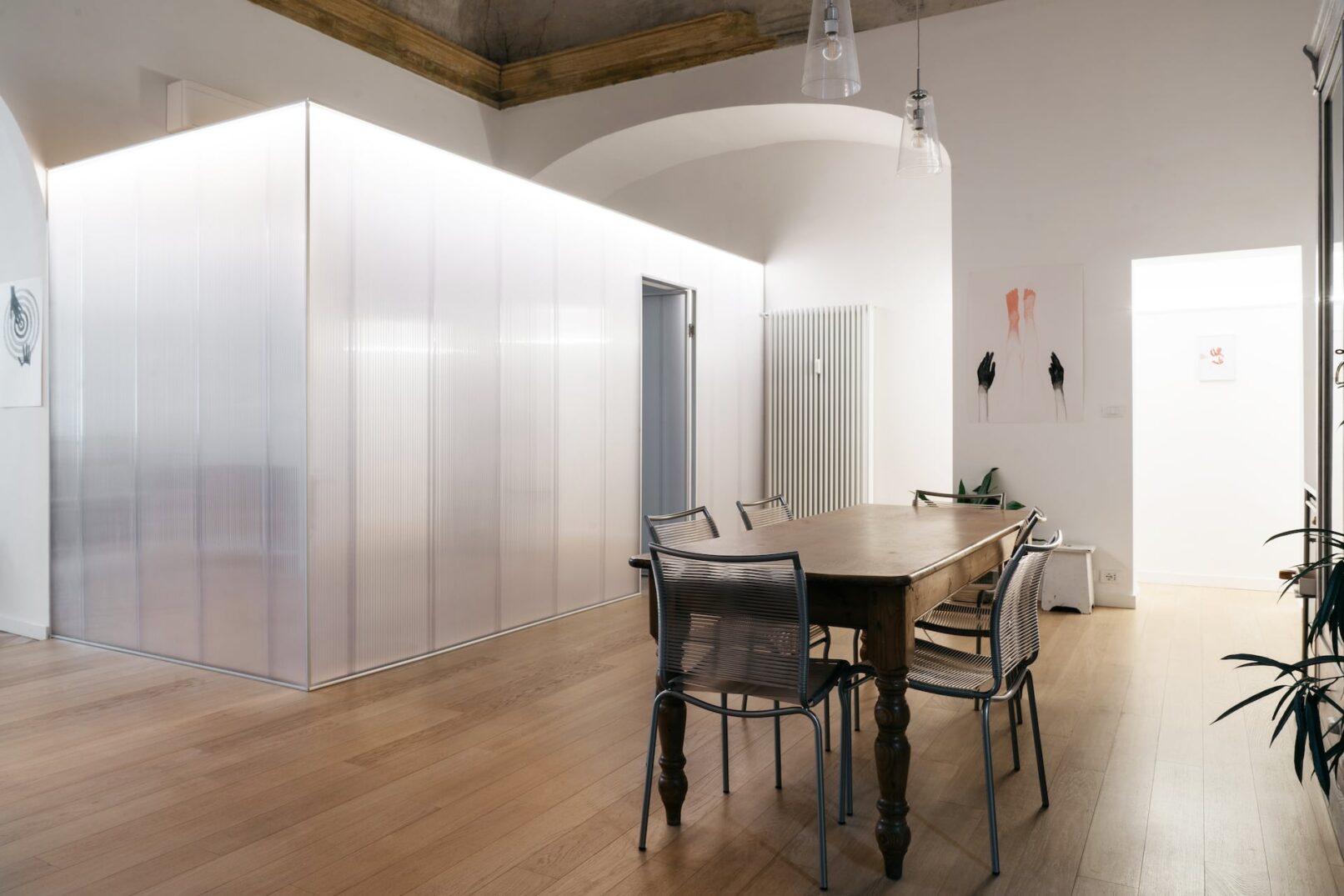 Situato nel cuore del quadrilatero romano di Torino, l’appartamento di una pittrice è situato al piano nobile dello storico Palazzo Ricardi di Netro. All’interno di un layout molto frammentato l’intervento di architettura ha portato ordine all’insieme degli ambienti attraverso l’inserimento di un dispositivo che contiene al suo interno una sede di funzioni di supporto. La ristrutturazione ha riportato alla luce un grande ambiente voltato sotto il quale è stata collocata la sala da pranzo. La casa non presenta corridoi, il passaggio da un ambiente all’altro avviene in maniera fluida ed è filtrato solamente dalla presenza di un volume in policarbonato che denuncia apertamente la sua contemporaneità. Il volume accompagna con la sua luce il visitatore dall’ingresso fino al cuore della casa. Alcune porte a scomparsa conducono verso gli ambienti più intimi mentre in corrispondenza della camera da letto il volume ospita il bagno privato e la cabina armadio.