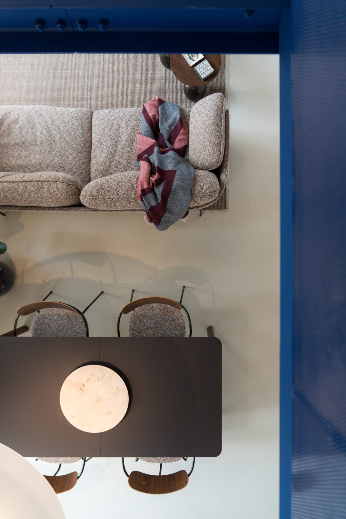 Quest’ultimo galleggia al centro dello spazio fronteggiando l’intera zona giorno e, con il suo caratteristico colore blu, illumina la totalità del monolocale, sospeso tra sfumature di bianco e panna.
