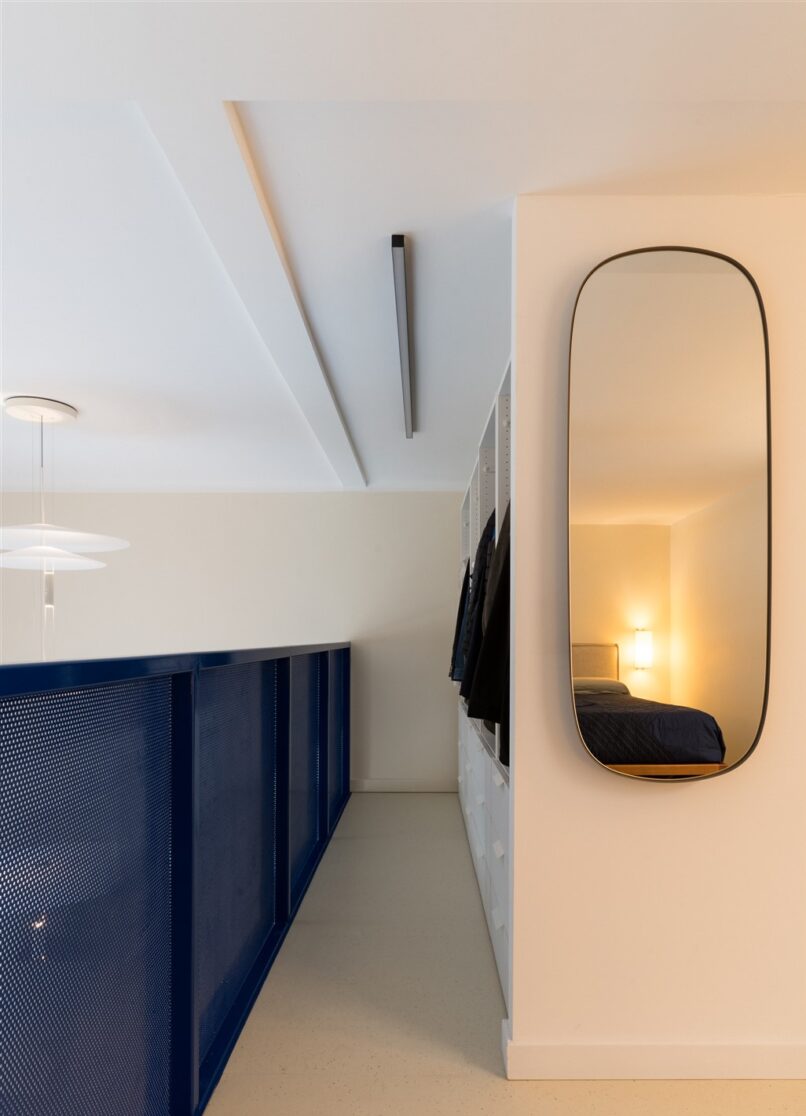 Bluplex è un monolocale organizzato su due livelli. Alla quota dell’ingresso trovano posto un bagno e la zona giorno, che si sviluppa lungo il fronte finestrato dell’appartamento, mentre una piccola scala conduce al piano soppalcato, destinato alla zona notte.