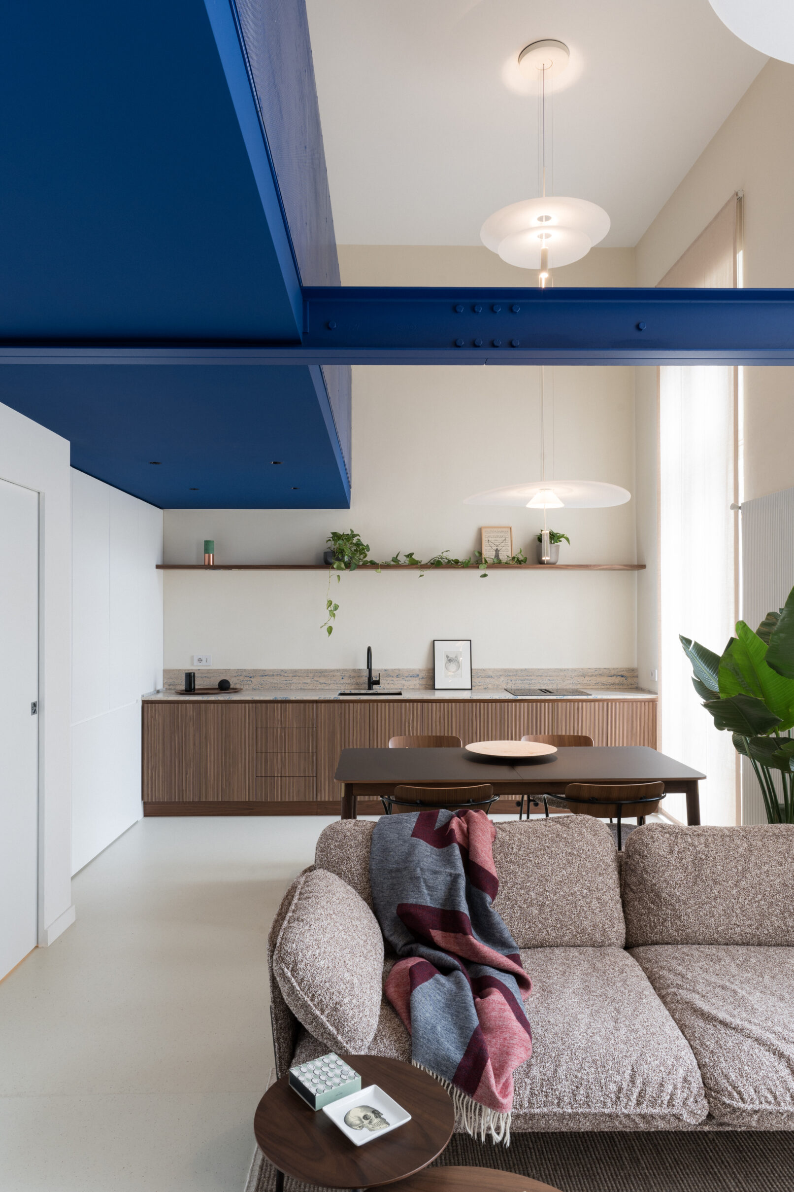 Come un fiume che sgorga dal soppalco, la scala, blu anch’essa, scende dolcemente facendosi largo tra due pareti per terminare in un grande pianerottolo che diventa mobile televisione. Dal lato opposto, una cucina lineare, con antine in noce cannettato, si sviluppa lungo tutto il fronte corto dell’ambiente.