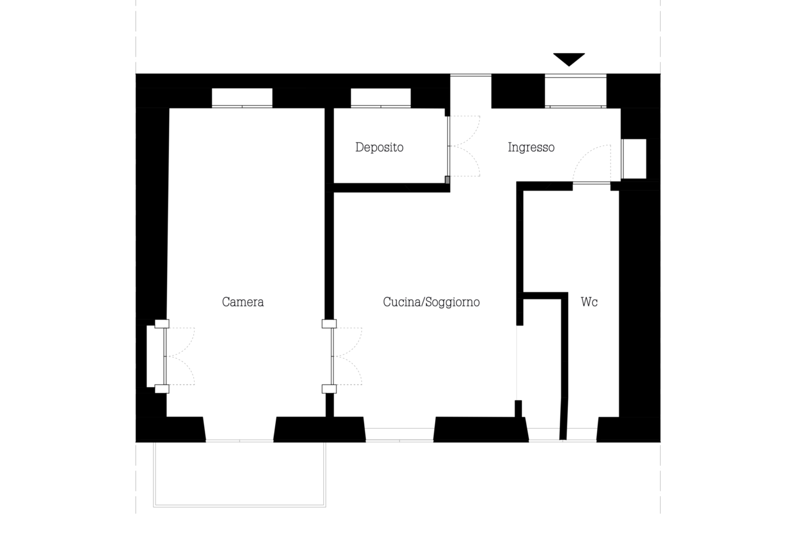La zona giorno e la zona notte sono separate da un semplice tramezzo traslucido in policarbonato che permettere di leggere in un colpo solo tutto il volume chiuso dell’appartamento. Le cornici delle porte sono allineate secondo l’antico schema distributivo dell’abitazione, sottolineandone l’antico aspetto aulico di passaggio da un ambiente all’altro senza l’utilizzo di corridoi. Tutte le funzioni di servizio sono state collocate in un volume funzionale, ribassato rispetto all’imposta della volta. Esso contiene l’ingresso all’abitazione, il bagno, la cucina e la cabina armadio.