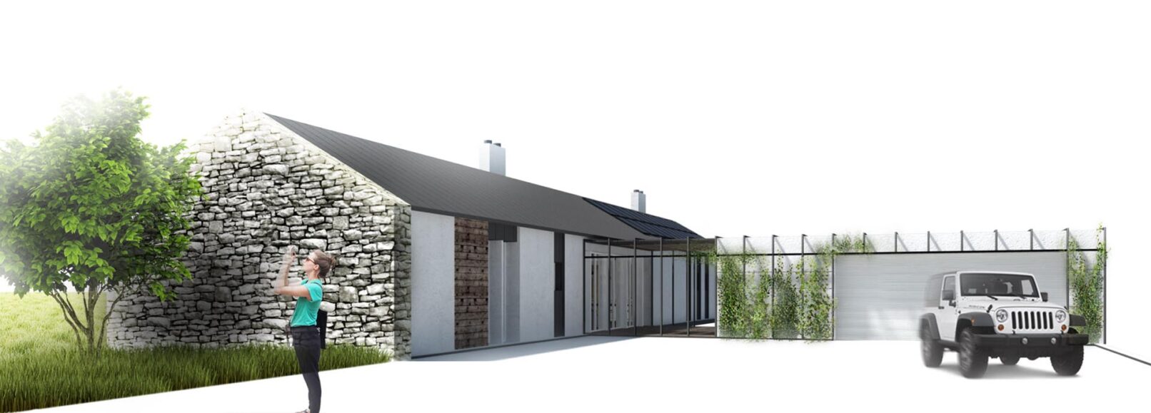 L’asse principale, quello dell’edificio,si sviluppa come una stecca mono-piano disposta seguendo un orientamento ottimale che permette a tutti gli ambienti disposti in linea di condividere la migliore vista sul paesaggio circostante.Questo primo orientamento è intercettato da un secondo, formato dal volume del garage-officina e da una pedana esterna che si distende perdendosi nel paesaggio.
