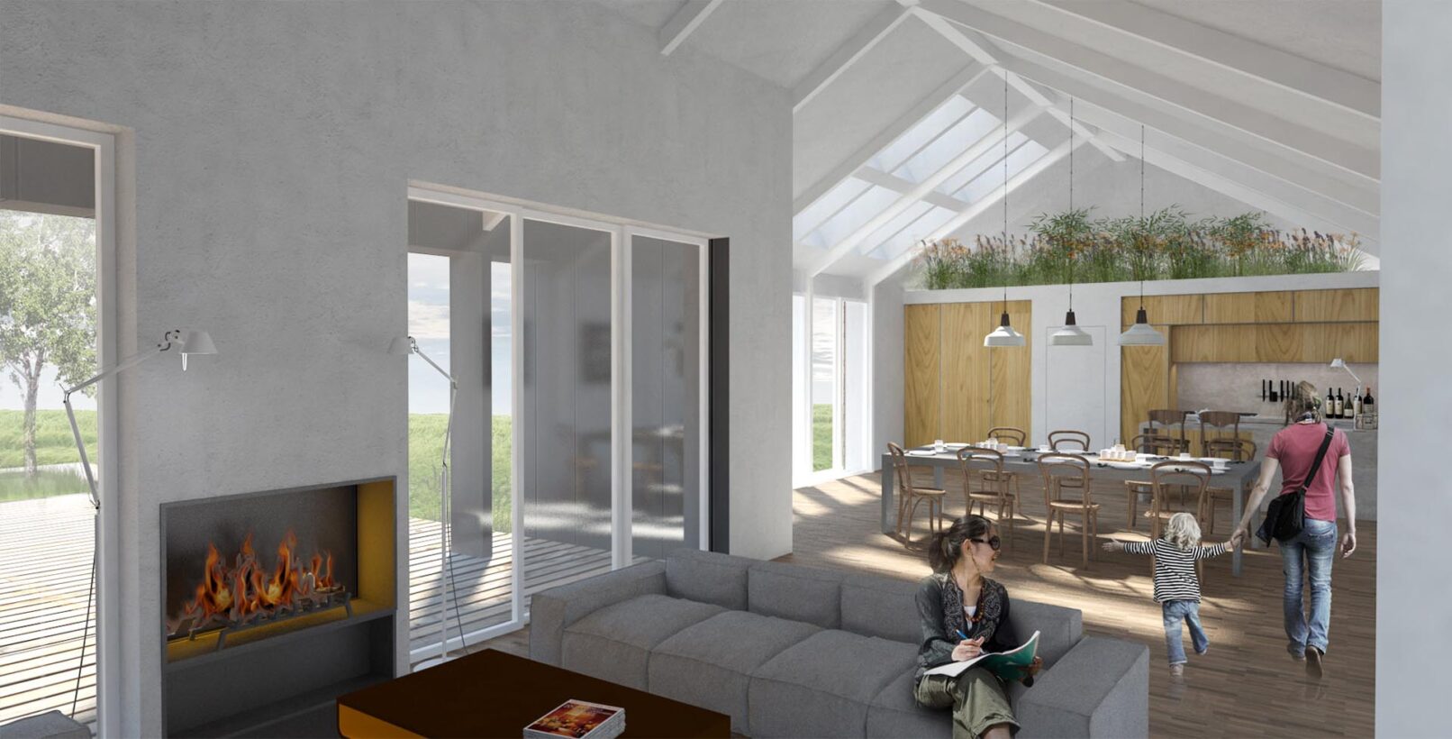 L’incrocio dei due assi è il fulcro dell’abitazione, l’area più pubblica. In esso si trovano l’accesso principale, collegato con il garage da una pergola e il salotto degli ospiti che si affaccia sul focolare e la pedana esterna. Le due stanze da letto si trovano agli estremi della stecca e si affacciano sulla zona giorno attraverso due blocchi di servizi (bagni e cabine armadio) che contribuiscono ad aumentarne il senso d’isolamento e intimità. La disposizione planimetrica consente inoltre di rendere le due camere indipendenti, nell’ipotesi di affittarle per fini turistici.
