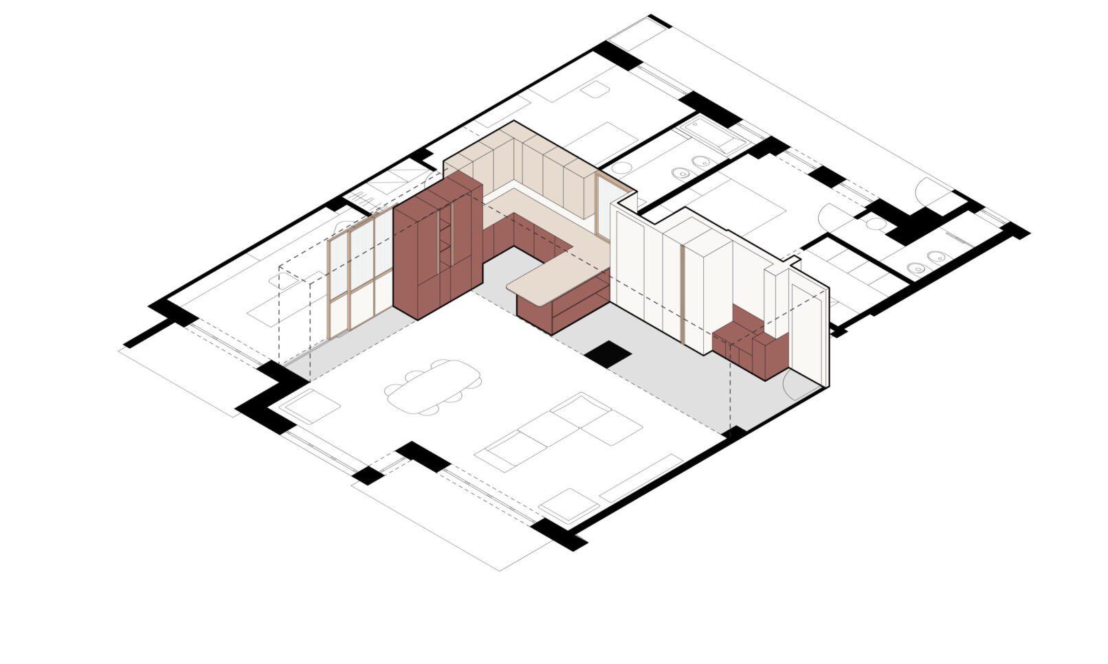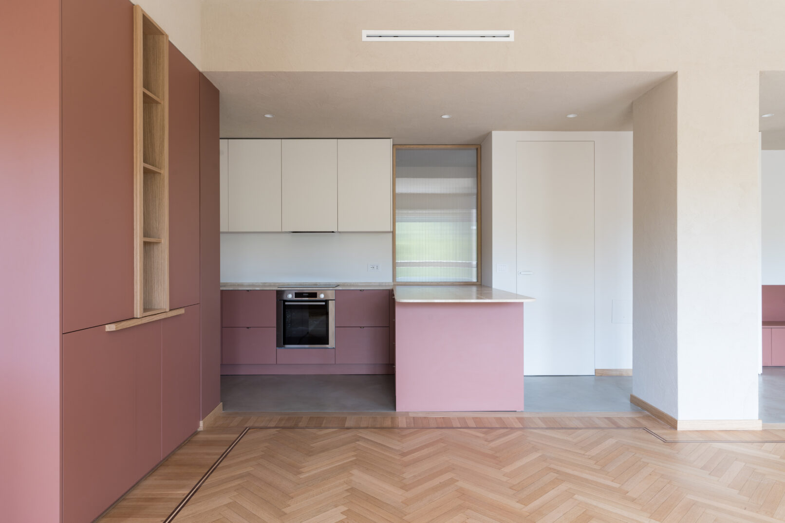Un ribassamento del soffitto, oltre a celare gli impianti di condizionamento, determina un nuovo fronte distributivo verso il soggiorno, una massa aperta che contiene al di sotto sedute e elementi funzionali di deposito, oltre alla cucina con penisola che diventa protagonista in un angolo del volume. La differenza di altezza tra spazio distributivo e spazio distribuito valorizza la proporzione della zona giorno e distingue chiaramente gli spazi servienti dagli spazi serviti.