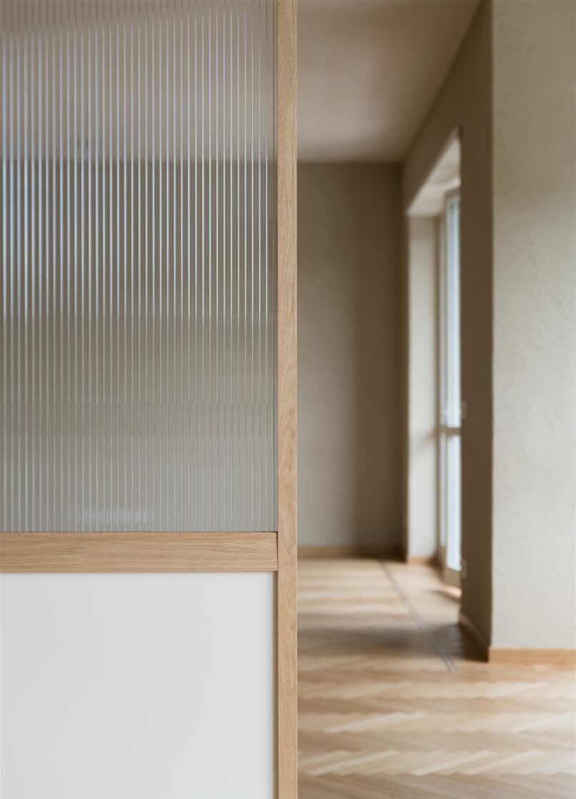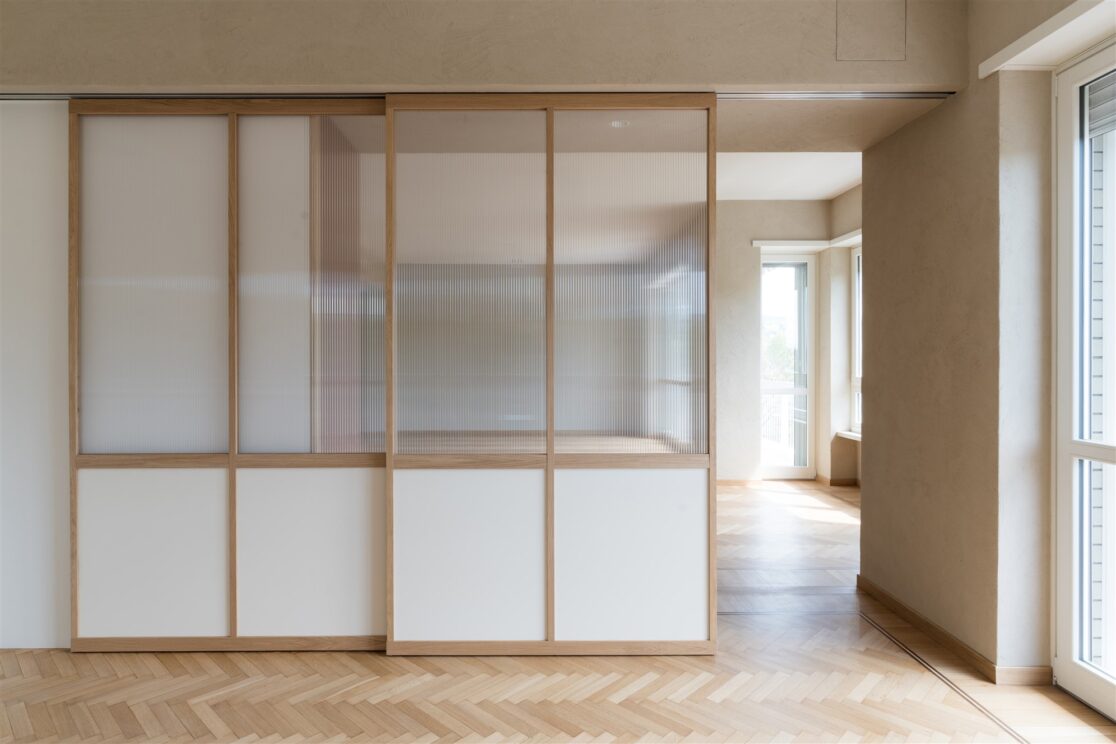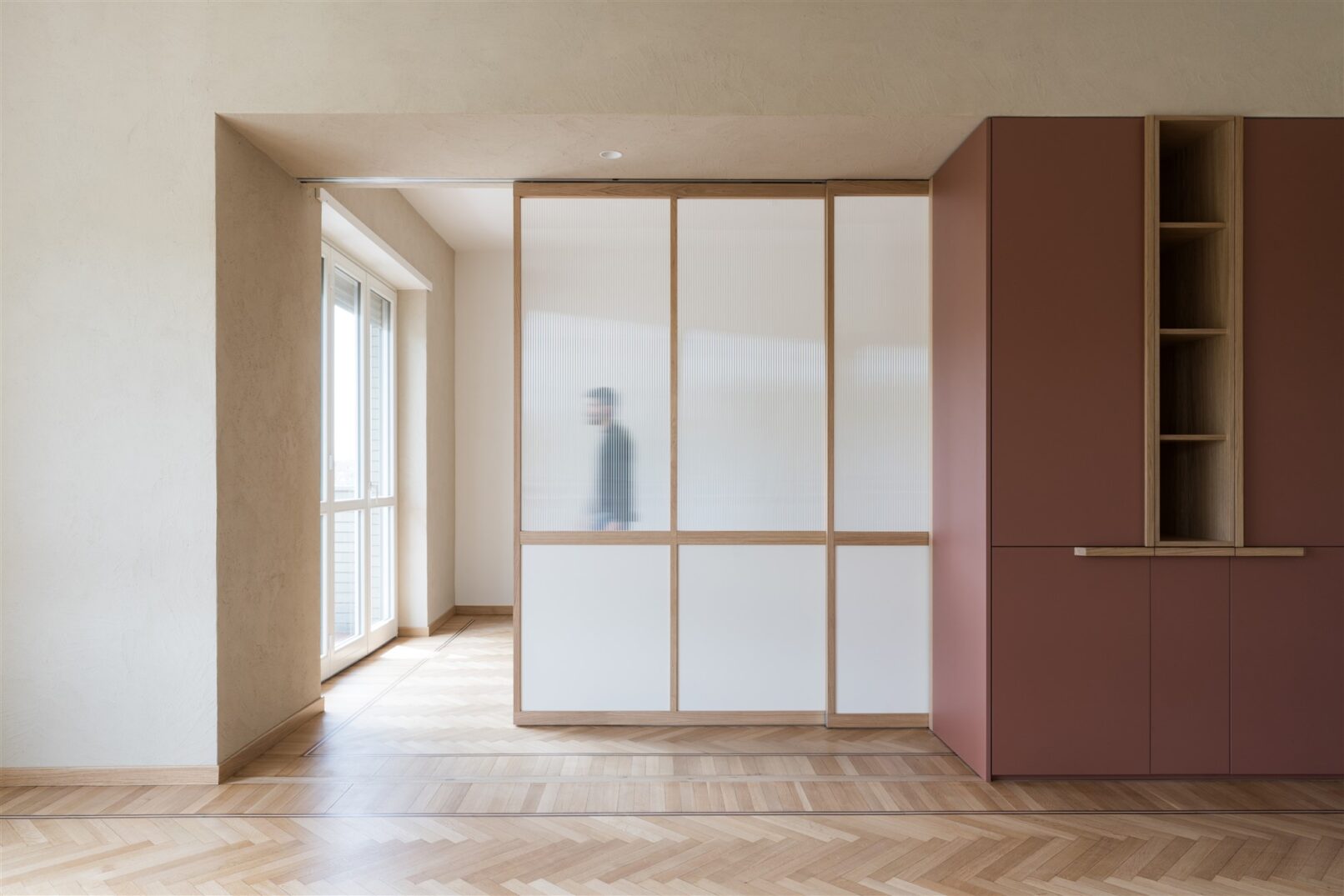 Una porta a tutta altezza conduce verso la zona notte in cui sono distribuite lungo un corridoio la camera master con bagno privato, il servizio principale e la camera dei bambini. Il corridoio non presenta un finale chiuso ma risvolta verso l’appendice della zona giorno generando un movimento fluido e circolare nonostante la netta divisione degli spazi. La distribuzione, pur trovandosi nel cuore dell’appartamento, è illuminata naturalmente da una parete traslucida collocata in prossimità dell’isola della cucina. Le camere sono dotate di cabina armadio per massimizzare lo spazio libero al loro interno.