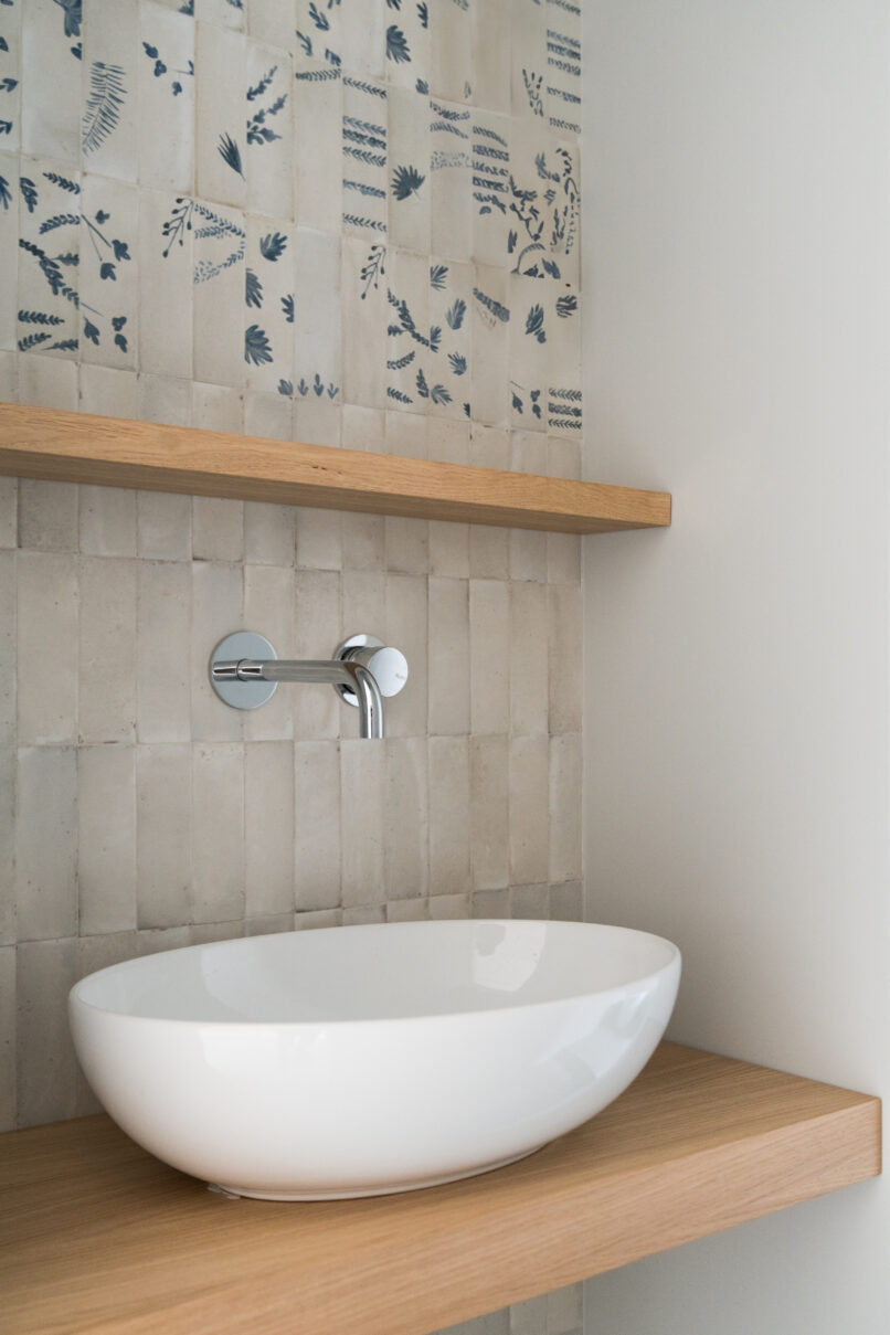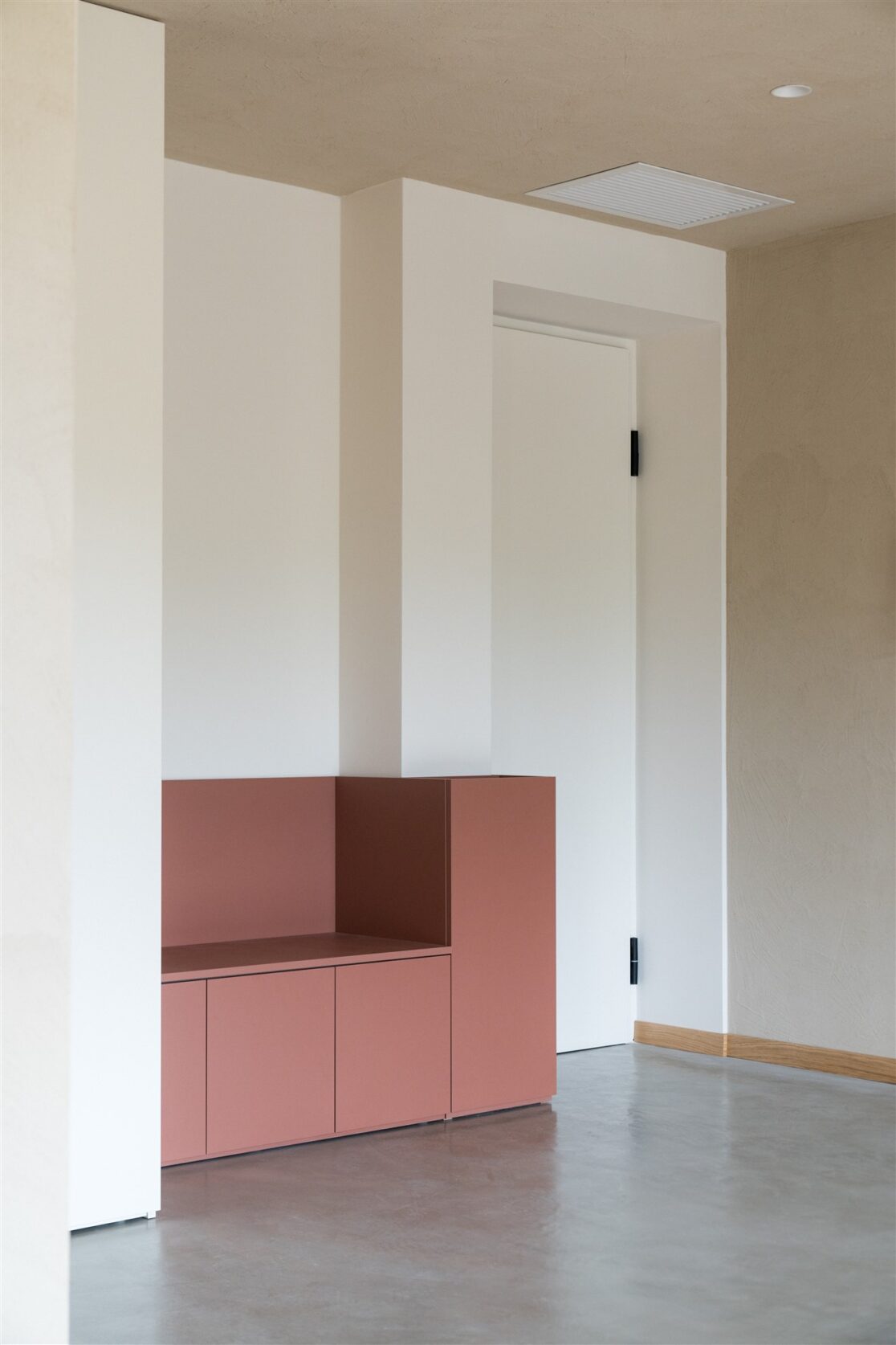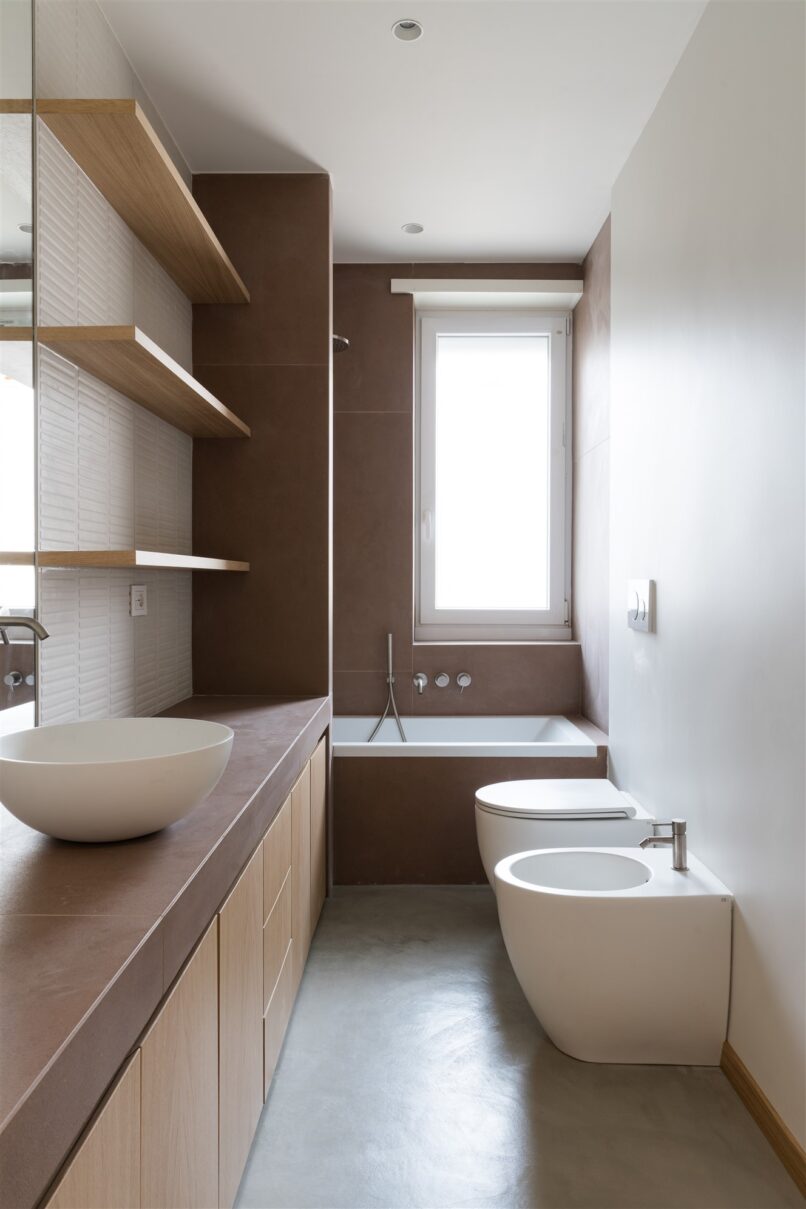 I materiali di finitura presentano richiami alla natura, come l’intonachino in terra cruda della zona giorno e il travertino della cucina. Sono privilegiati toni caldi e distesi come il cemento naturale, il legno a terra recuperato, il rosso mattone.