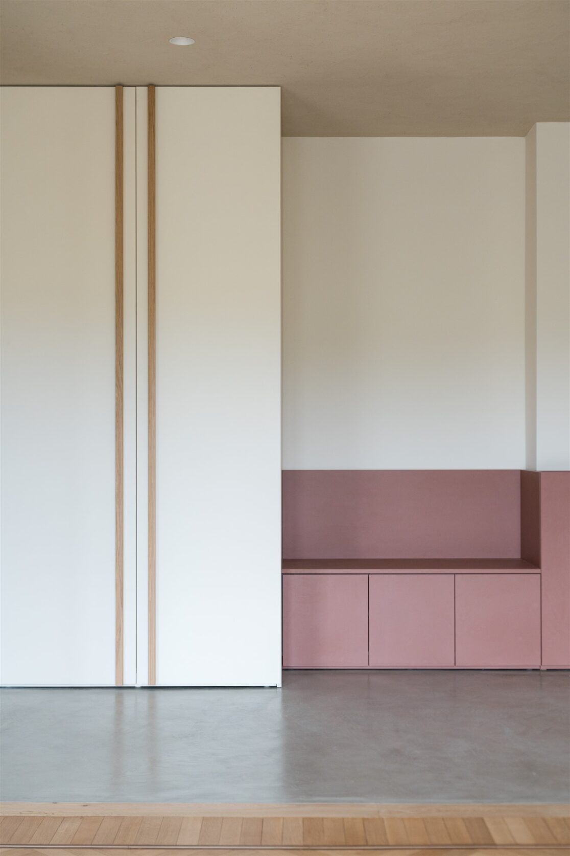 Le demolizioni e la nuova organizzazione spaziale sono state pensate per esaltare già dall’ingresso la percezione del fiume e della collina offerto dalle grandi vetrate. La zona giorno si sviluppa sull’intero affaccio disponibile ed è dotata di un’appendice flessibile. È uno spazio modulabile attraverso la chiusura di ante in policarbonato che possono determinare all’occorrenza uno sazio più appartato, configurabile come camera extra.