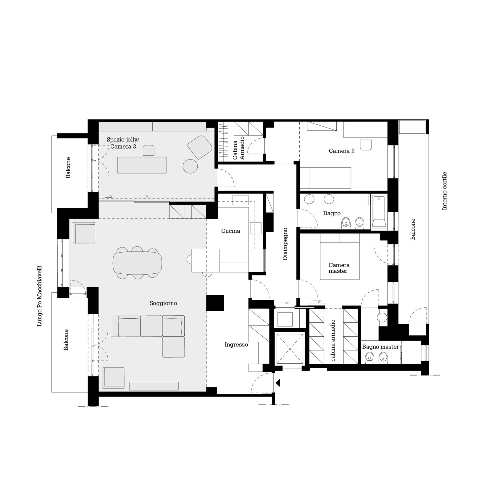 Un ribassamento del soffitto, oltre a celare gli impianti di condizionamento, determina un nuovo fronte distributivo verso il soggiorno, una massa aperta che contiene al di sotto sedute e elementi funzionali di deposito, oltre alla cucina con penisola che diventa protagonista in un angolo del volume. La differenza di altezza tra spazio distributivo e spazio distribuito valorizza la proporzione della zona giorno e distingue chiaramente gli spazi servienti dagli spazi serviti.