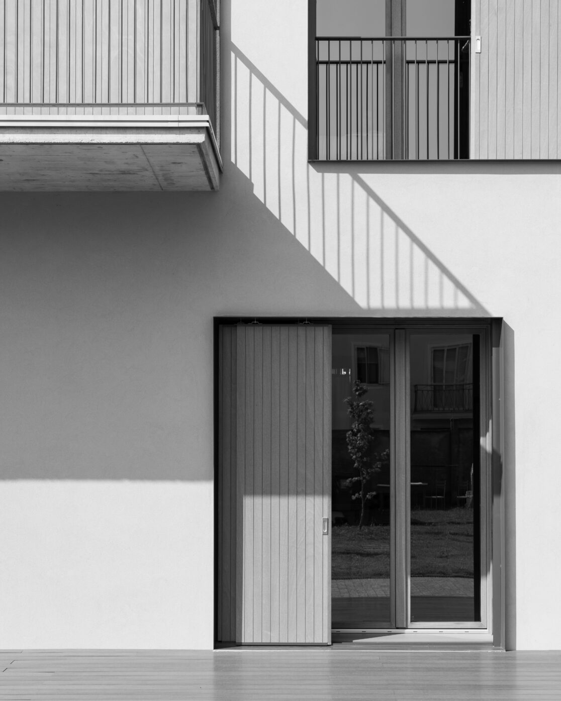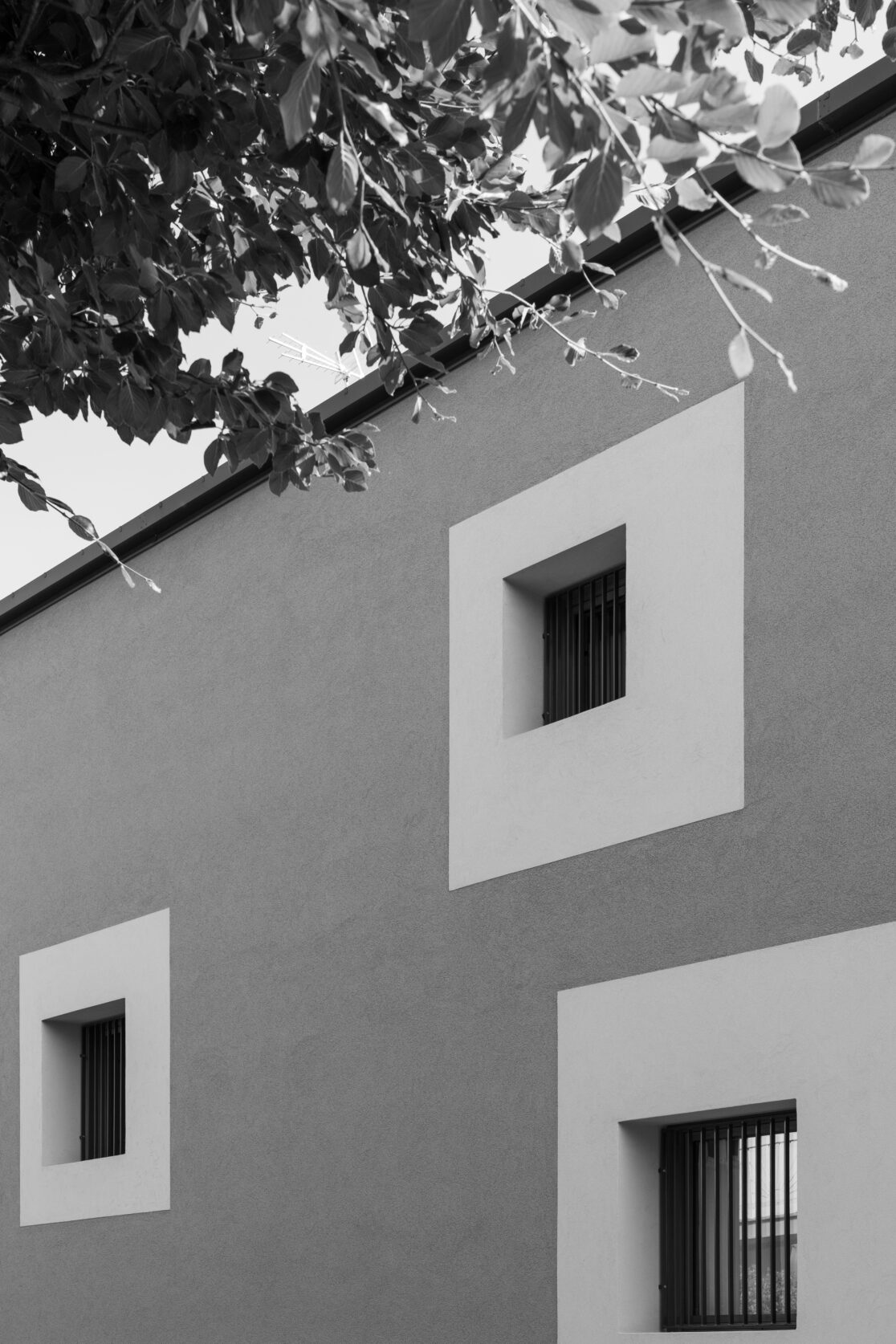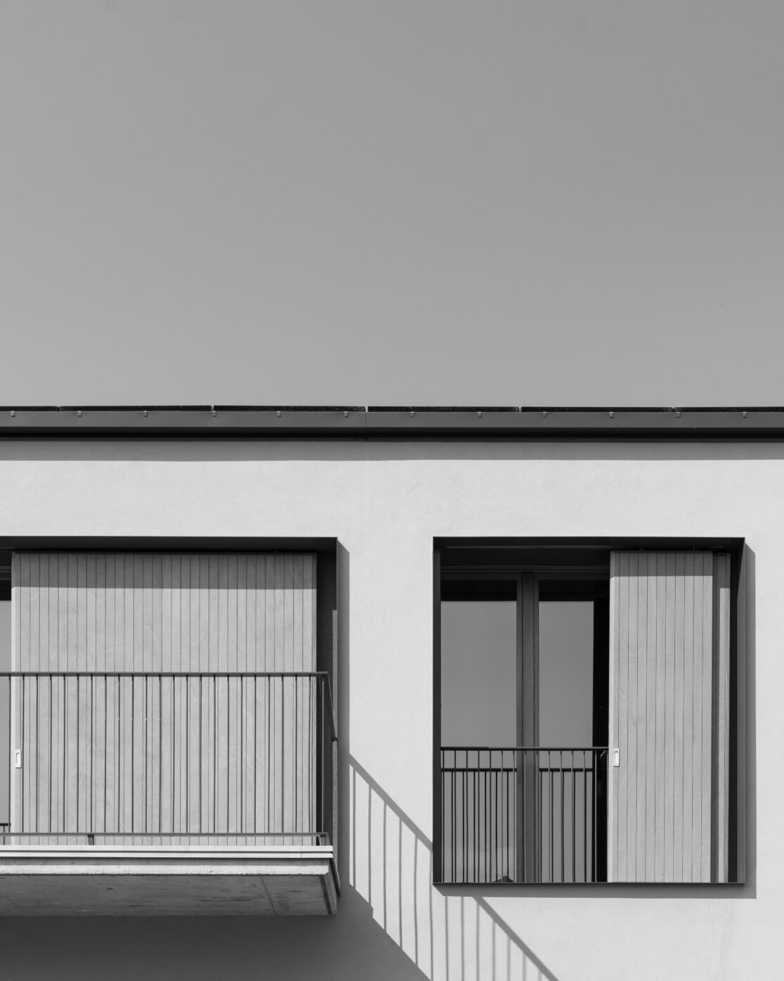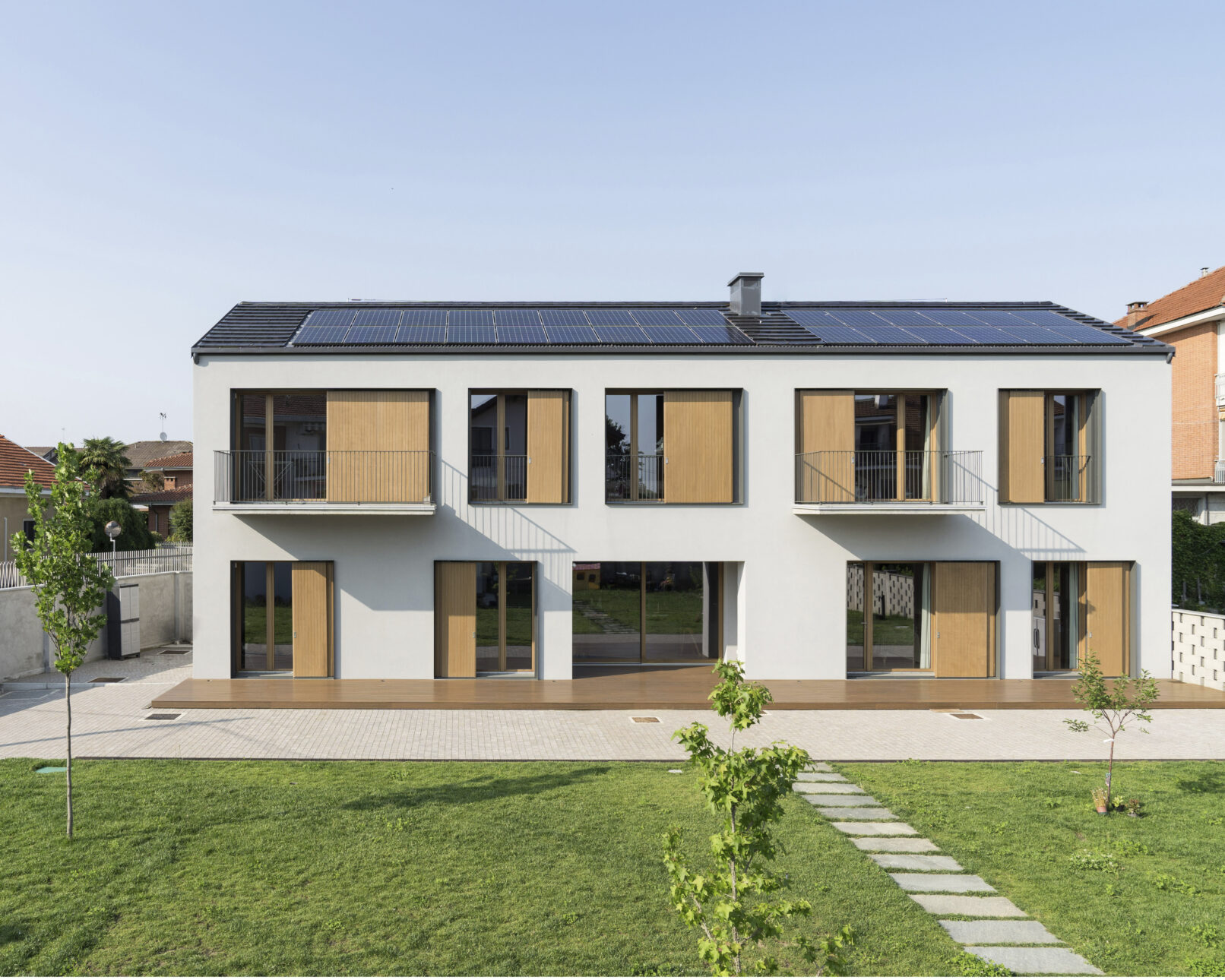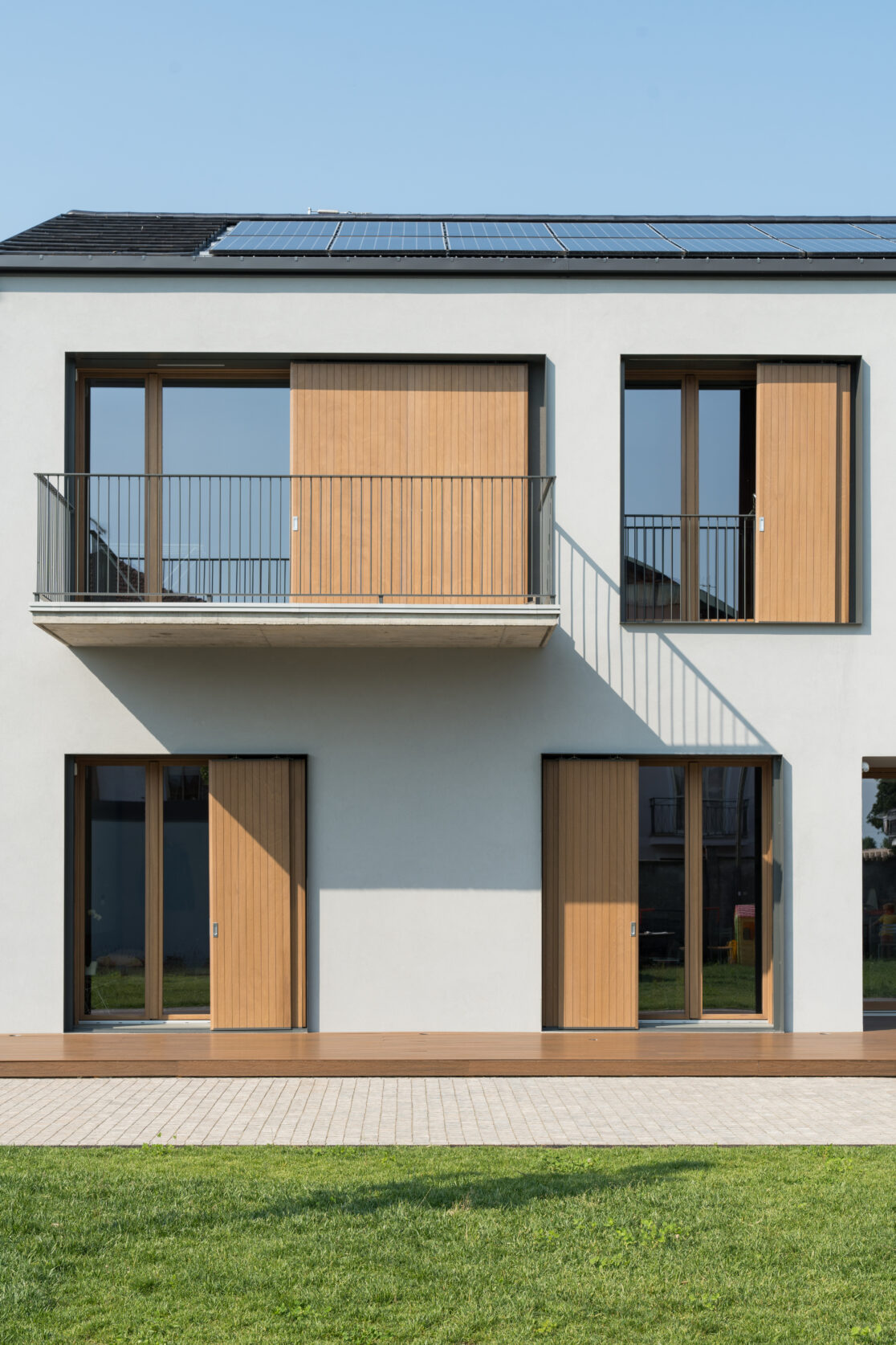 La villa bifamiliare, divisa tra due nuclei della stessa famiglia, si sviluppa in senso longitudinale con una manica di circa 7-8 m. Gli ambienti principali sono esposti a sud mentre gli ambienti di servizio a nord. Questa disposizione, inserita in una pinta libera da pilastri all’interno della manica, genera grandi vetrate a sud e finestre molto più piccole e contenute con andamento randomico sul lato nord. Questi accorgimenti son stati pensati soprattutto per massimizzare gli apporti solari nel periodo estivo, che congiuntamente ad altri temi come ad esempio pannelli solari, pompa di calore ed un massiccio cappotto esterno portano Manica semplice ad avvicinarsi molto ad una casa passiva.