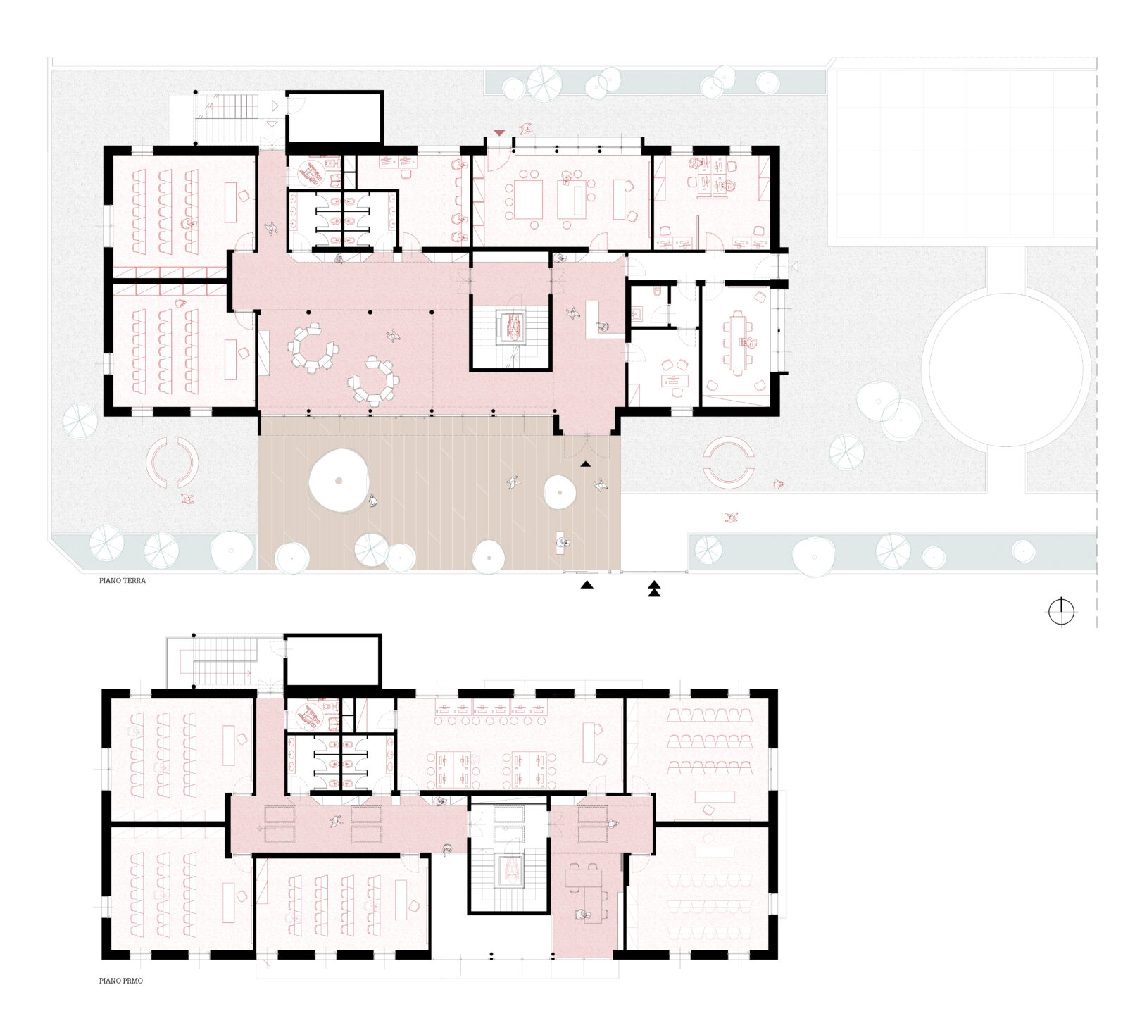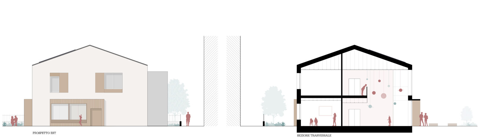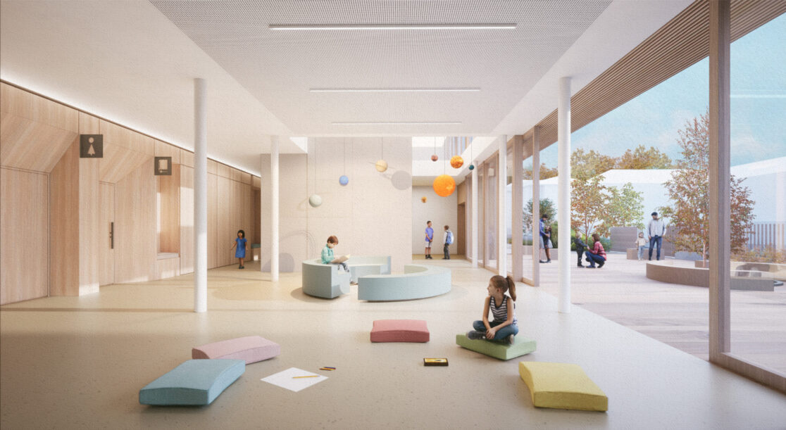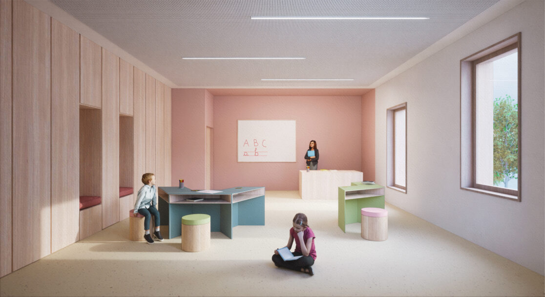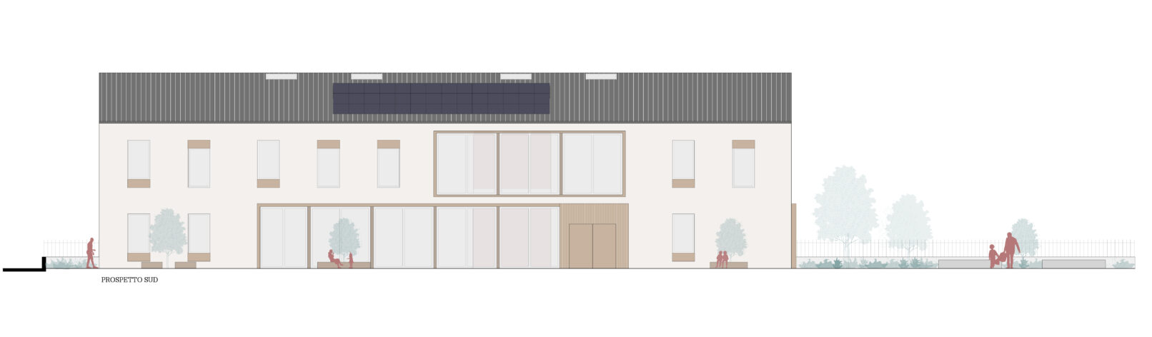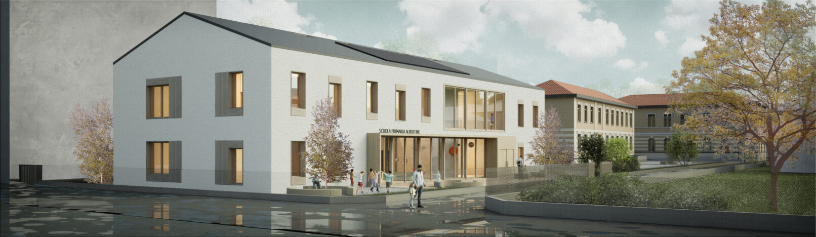 Da un punto di vista compositivo la nuova scuola primaria è costituita da un parallelepipedo unitario e compatto, le cui componenti vetrate mostrano un interno caratterizzato da ambienti caldi e confortevoli, organizzati secondo una disposizione gerarchica degli spazi e un attento studio dei flussi per favorire l’orientabilità e l’autonomia degli studenti. La biblioteca e i laboratori trovano collocazione al piano terra affinché siano facilmente accessibili dall’esterno. Sempre al piano terra lo spazio parascolastico si presenta come una grande sala flessibile, in grado di ospitare differenti tipologie di attività attraverso un setting semplice da modificare tramite pannelli mobili. Questo spazio inclusivo, favorisce l’apprendimento coinvolgendo corporeità e movimento tramite pannelli scorrevoli in materiali trasparenti che collegano visivamente gli spazi.
