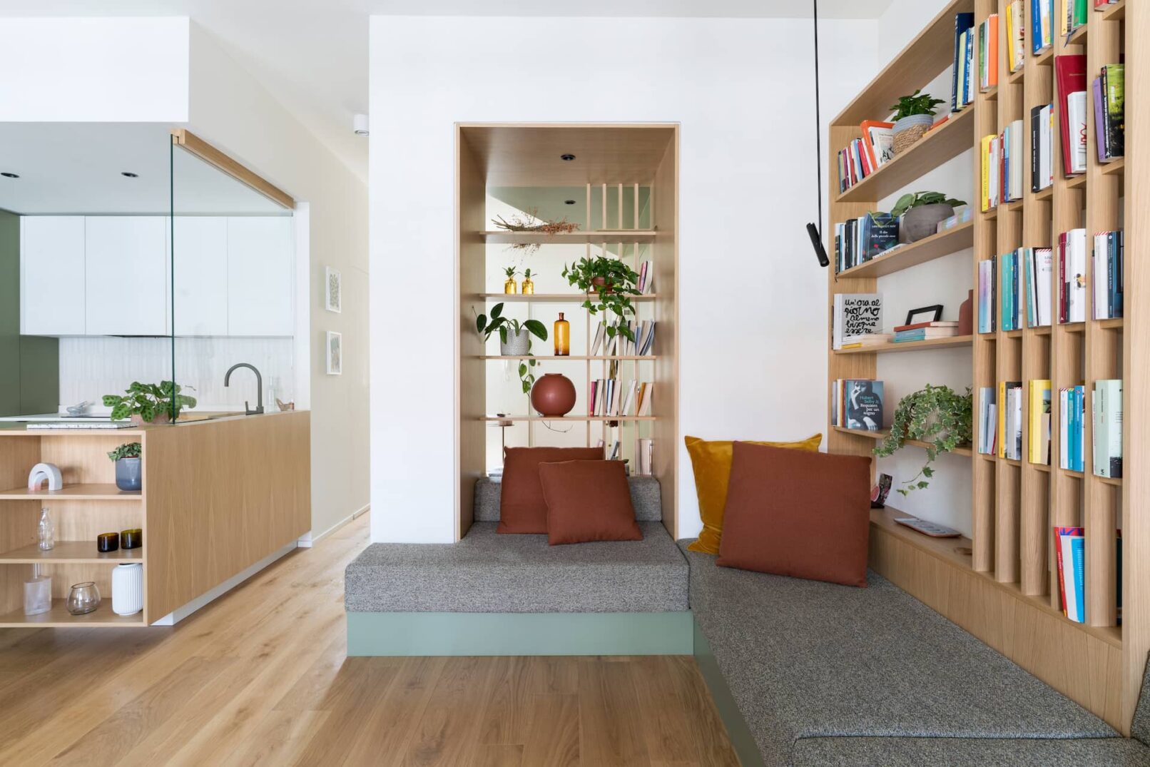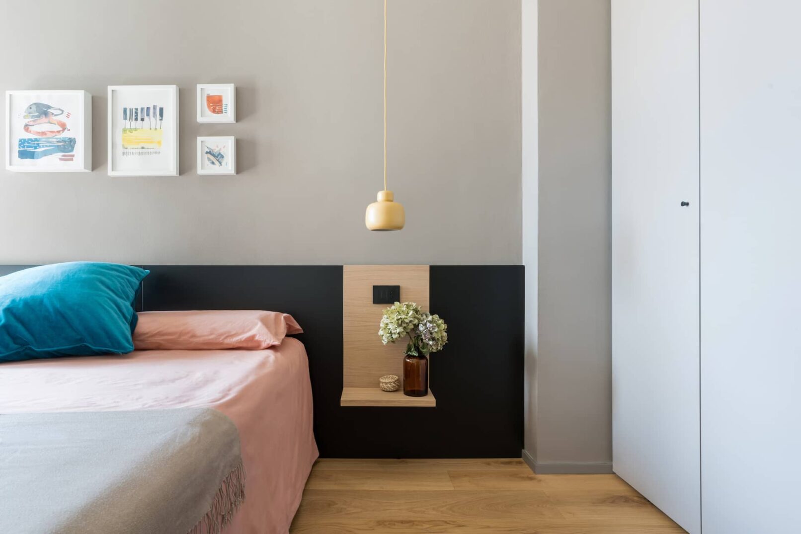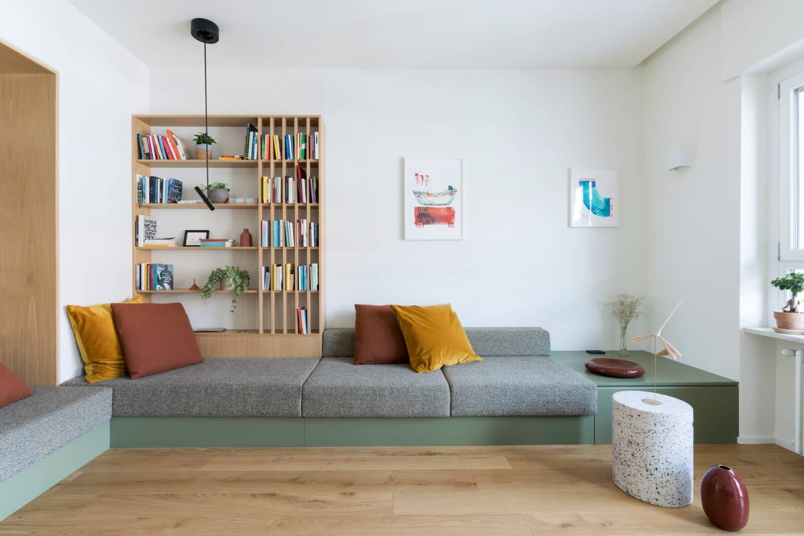 Spazio Mando rivisita in chiave contemporanea un appartamento torinese degli anni ’70 del Novecento, un periodo in cui si dava grande spazio alla zona d’ingresso e gli ambienti erano suddivisi secondo criteri funzionali. La scelta progettuale tende a scardinare questo assetto planimetrico, dando origine ad uno spazio fluido e continuo che apre le visuali verso le grandi finestre e la luce naturale. L’ingresso non è più considerato una camera delimitata da quattro pareti ma accoglie e indirizza verso lo spazio domestico, ricco di dinamicità e cromie inaspettate. Per poter comunicare quest’idea, è stato necessario rompere la linearità dell’assetto planimetrico e i toni neutri dell’abitazione, conferendogli una forte potenza espressiva, tagliente nelle linee e nella sua cromia. L’arredo fisso si configura come un grande oggetto multifunzione: la libreria in legno dell’entrata si articola in un divano su misura che definisce una zona intima e accogliente. La zona giorno è caratterizzata da un grande open-space in cui si trovano la sala da pranzo e il salotto affacciati sulla terrazza. La cucina è incassata, in una rivisitazione contemporanea dell’angolo cottura, che presenta un lato vetrato per dare più respiro verso il soggiorno. La camera da letto, cui si accede tramite una porta a scomparsa integrata nel volume d’ingresso, prende il posto del tinello verso l’interno cortile. Il vecchio angolo cottura si trasforma in piccolo studiolo per le occasioni di lavoro da casa.