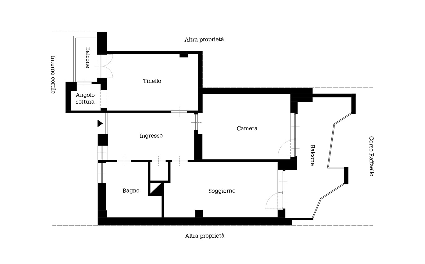 Spazio Mando rivisita in chiave contemporanea un appartamento torinese degli anni ’70 del Novecento, un periodo in cui si dava grande spazio alla zona d’ingresso e gli ambienti erano suddivisi secondo criteri funzionali. La scelta progettuale tende a scardinare questo assetto planimetrico, dando origine ad uno spazio fluido e continuo che apre le visuali verso le grandi finestre e la luce naturale. L’ingresso non è più considerato una camera delimitata da quattro pareti ma accoglie e indirizza verso lo spazio domestico, ricco di dinamicità e cromie inaspettate. Per poter comunicare quest’idea, è stato necessario rompere la linearità dell’assetto planimetrico e i toni neutri dell’abitazione, conferendogli una forte potenza espressiva, tagliente nelle linee e nella sua cromia. L’arredo fisso si configura come un grande oggetto multifunzione: la libreria in legno dell’entrata si articola in un divano su misura che definisce una zona intima e accogliente. La zona giorno è caratterizzata da un grande open-space in cui si trovano la sala da pranzo e il salotto affacciati sulla terrazza. La cucina è incassata, in una rivisitazione contemporanea dell’angolo cottura, che presenta un lato vetrato per dare più respiro verso il soggiorno. La camera da letto, cui si accede tramite una porta a scomparsa integrata nel volume d’ingresso, prende il posto del tinello verso l’interno cortile. Il vecchio angolo cottura si trasforma in piccolo studiolo per le occasioni di lavoro da casa.