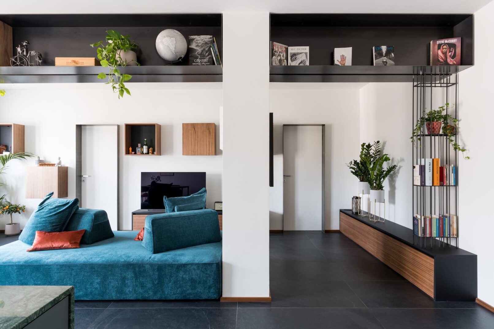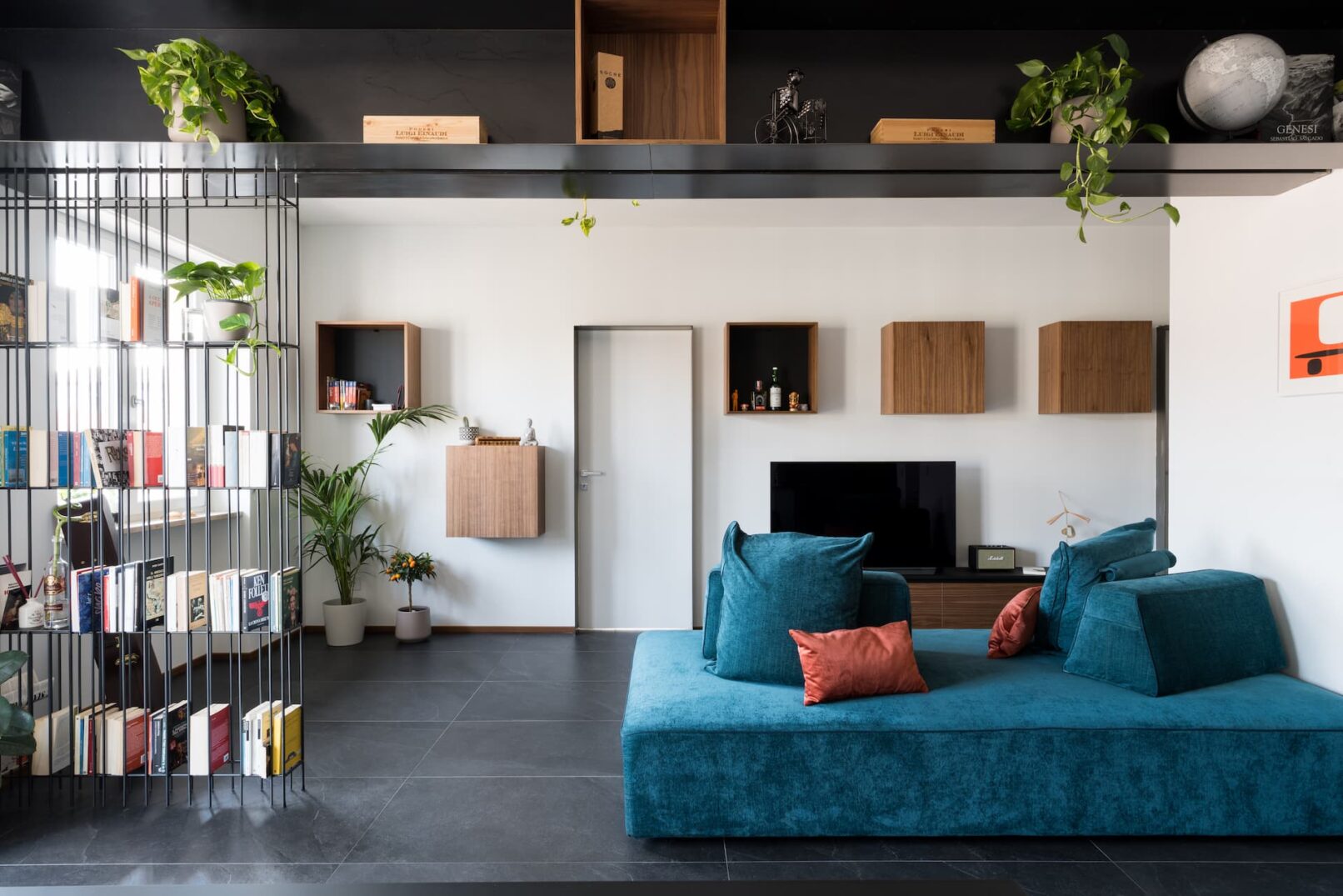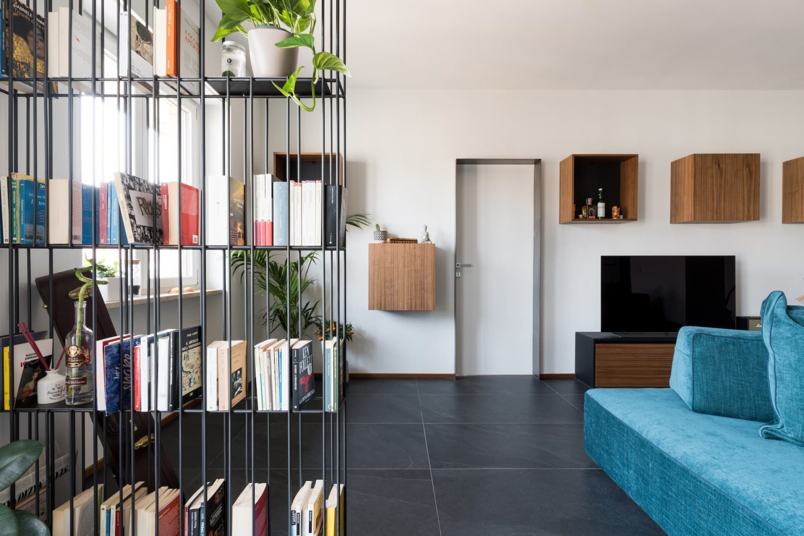 Varcato l’ingresso, i grandi formati delle ceramiche a pavimento scandiscono il movimento verso il cuore del soggiorno. Una trave/libreria in ferro divide in due lo spazio individuando una parte di salotto più conviviale, rivolta verso l’ingresso, ed una più intima e privata verso la zona notte. Questo particolare dispositivo d’arredo è stato progettato per ospitare libri ed oggetti su entrambi i lati e cela al suo interno una lama di luce che illumina la zona giorno. Agli estremi della trave sospesa sono integrate due librerie composte da un fitto intreccio di bacchette metalliche, Il cui disegno trae ispirazione dalle corde di una chitarra, grande passione del proprietario.