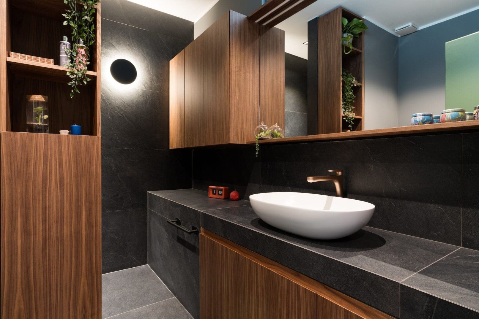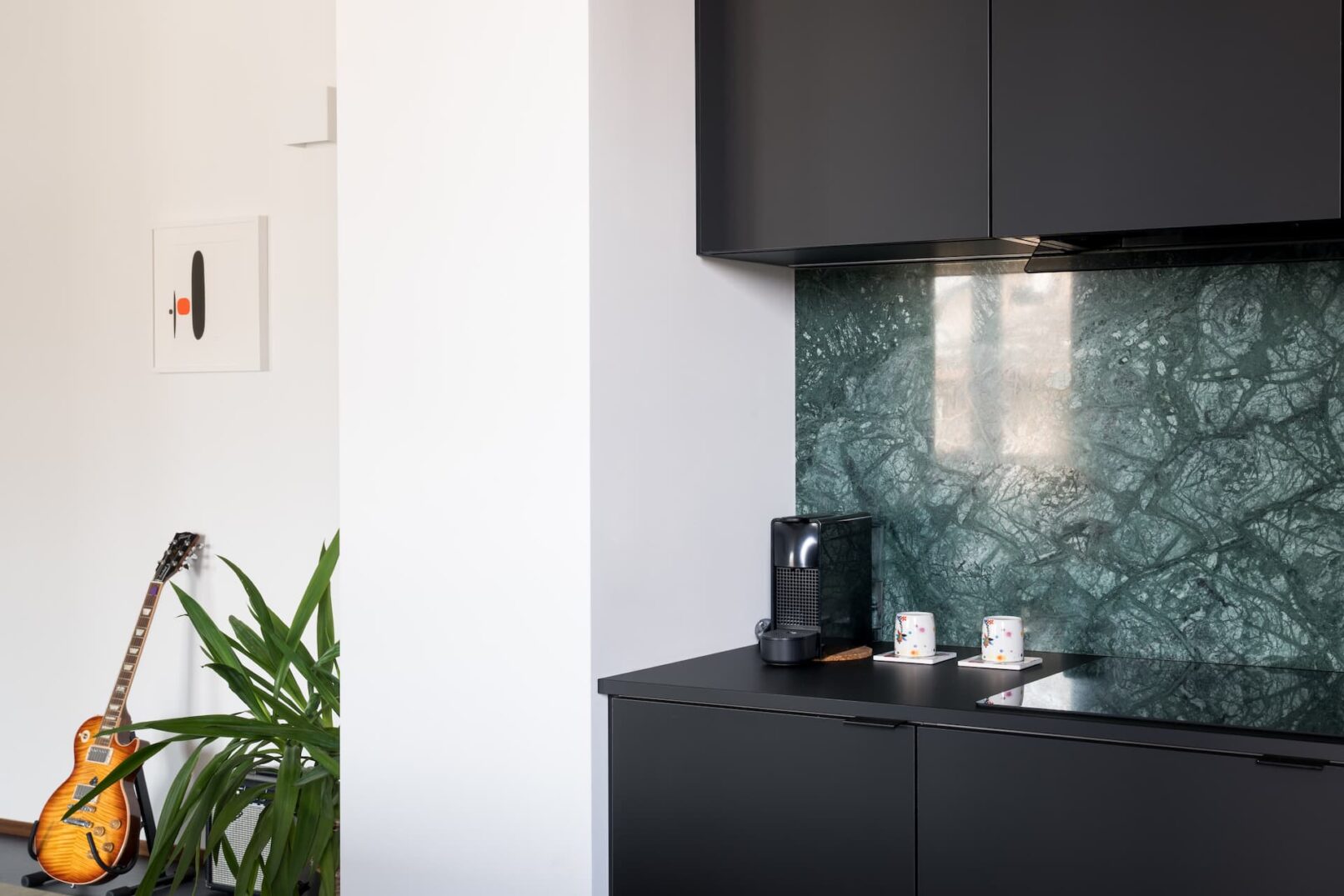 Accanto all’ingresso, in uno spazio riparato rispetto al soggiorno, trova posto la cucina total-black, la cui continuità visiva è interrotta soltanto dal piano in marmo guatemala. La penisola, rivestita col medesimo materiale, irrompe nella zona living, connettendo i due ambienti.